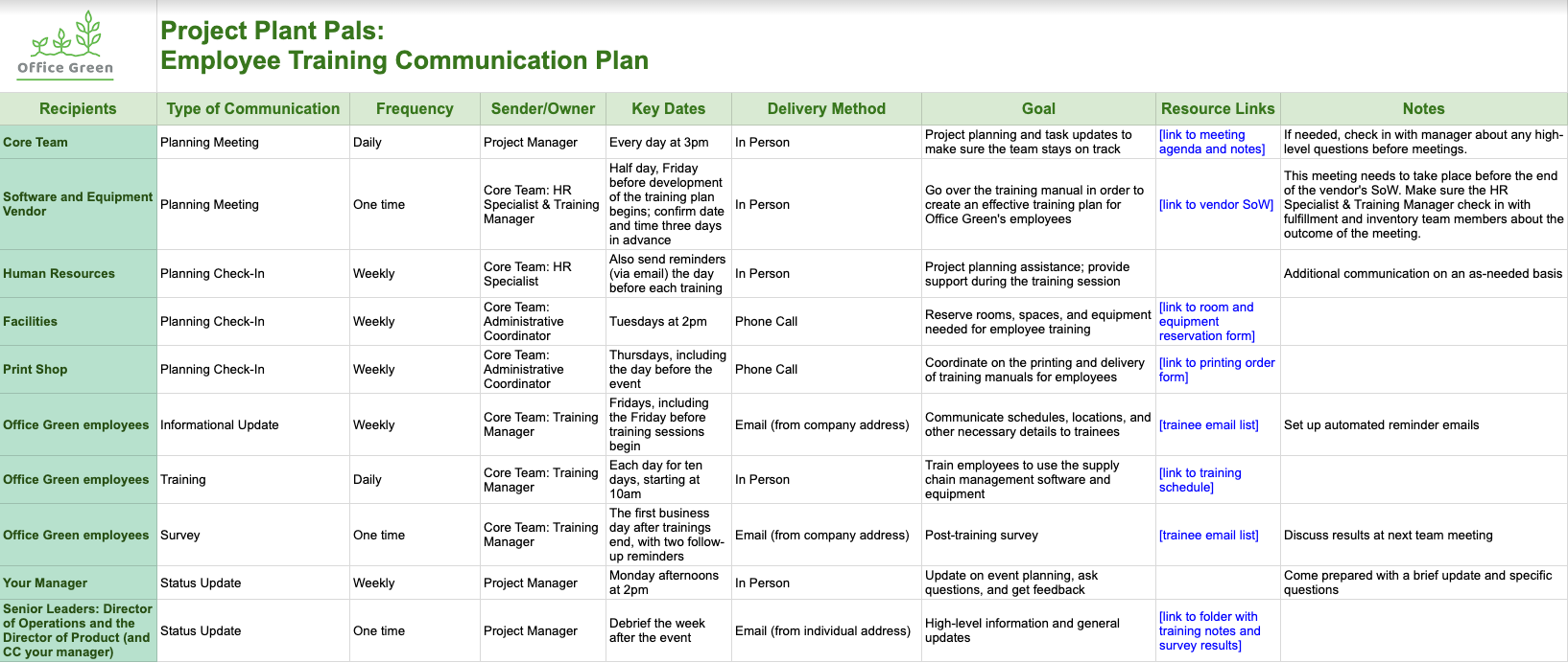Training for Office Green employees: The Training Manager will also run the in-person trainings, which are scheduled each day for ten days, beginning at 10:00 AM. You make sure to link to the training schedule, so that itâs easily accessible.