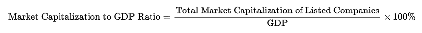 The Market Capitalization to GDP Ratio compares the total market value of a country’s publicly traded companies (stock market capitalization) to its Gross Domestic Product (GP)